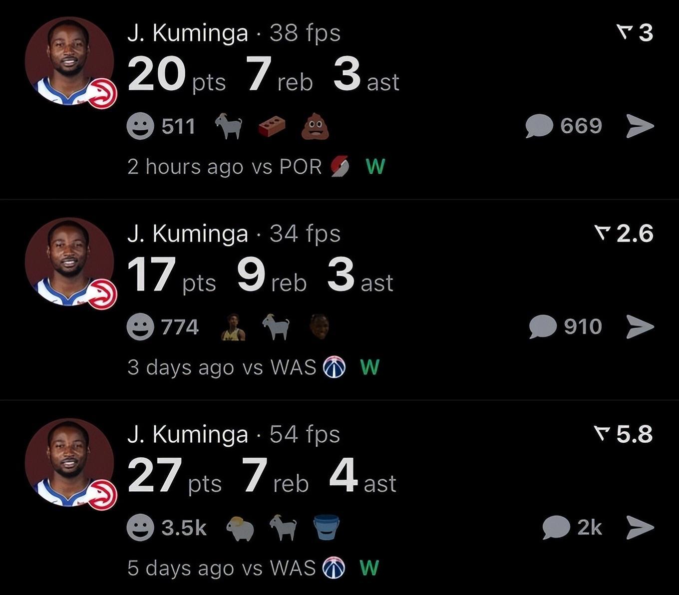 而他的这次爆炸表现之后,最近的这三场比赛,库明加为老鹰队贡献了场均21.3分7.7篮板3.3助攻的数据,场均已经完成了20+,考虑到他是替补上场,库明加打得是真的很爽。老鹰球迷已经完全嗨了,拿了一个病号波尔津吉斯换来了库神?他们的球迷在比赛过程当中大喊:“谢谢你,金州勇士!”